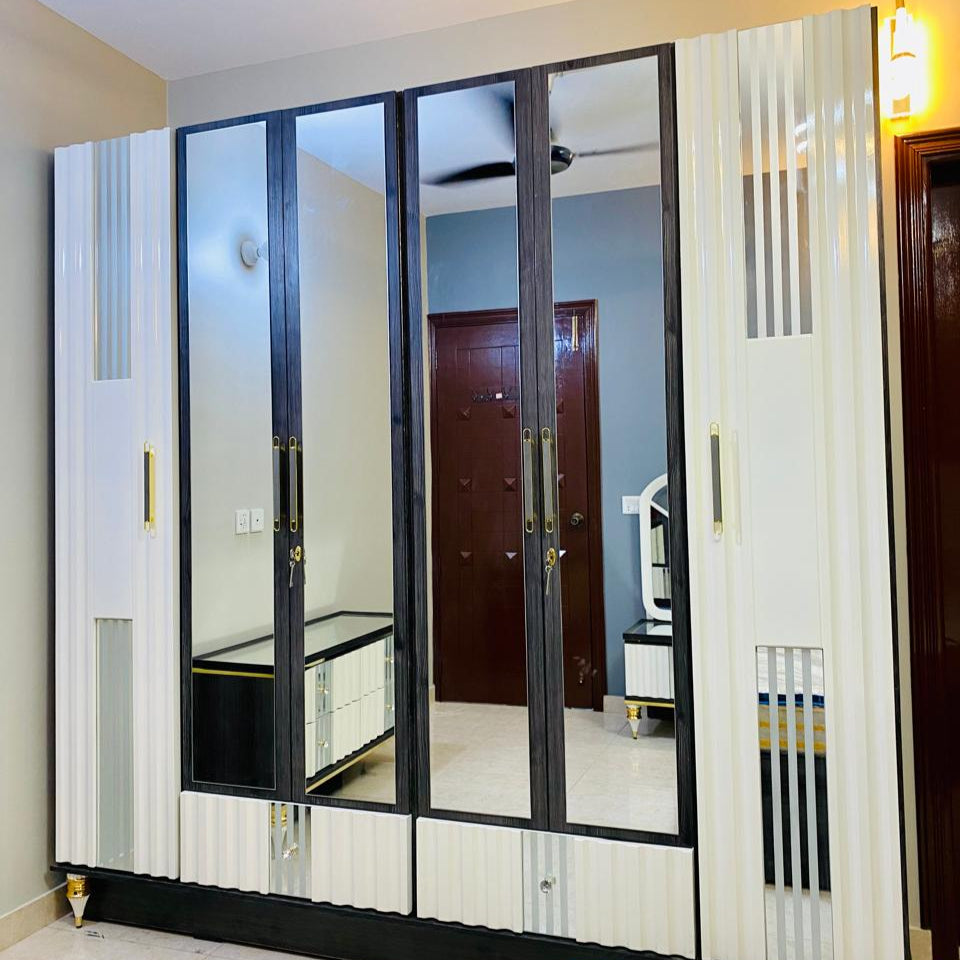 This modern bedroom set combines elegance with practicality, designed to enhance any contemporary home. The centerpiece is a sleek bed with a bold dark wood base and a large upholstered headboard in a textured white fabric, framed with golden detailing for a touch of luxury. Matching bedside tables feature glossy tops, ribbed drawer designs, and golden legs, paired with stylish geometric mirrors that add depth and sophistication. Perfect for creating a modern yet cozy atmosphere, this set offers both comfort and timeless appeal.